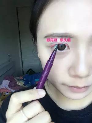 1.我建議剛學畫眼線的童鞋,使用液體眼線筆。畫眼線首先在眼頭、眼中、眼尾各畫上一筆,定好每個位置眼線的粗細。一般來說都是眼頭細,眼尾粗。